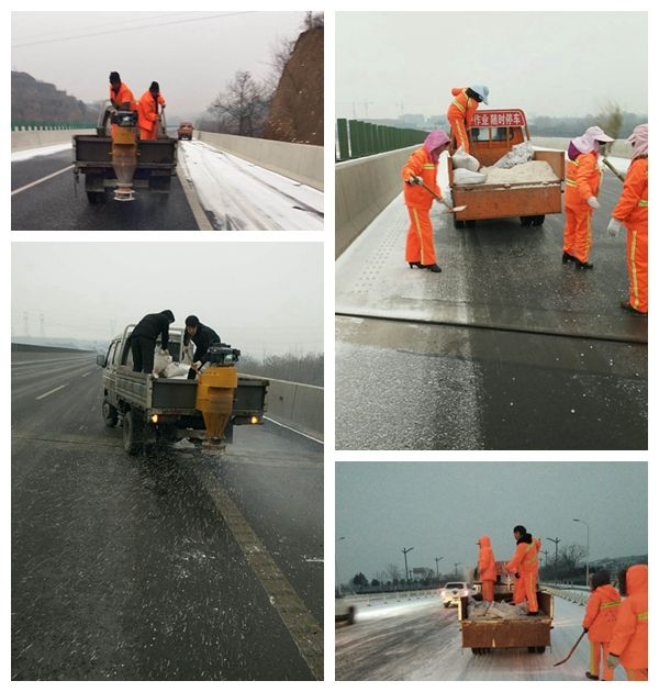 凛冽寒风中,路政人员疏导和分流车辆,维护道路秩序,养护人员在人工清扫的同时抛洒融雪剂,确保道路无积雪、无残冰、见路面。对G207锡海线大坡口、S238常付线大坡口、S243郭木线瀍阳大坡段、S314郑三线沟口坡、G310、孟邙线、洛吉快速通道等重点路段和急弯、陡坡、桥面等易结冰、行车危险路段,路政养护密切配合,进行重点保通和清理,最大限度的减少雨雪冰冻天气对道路交通的影响。