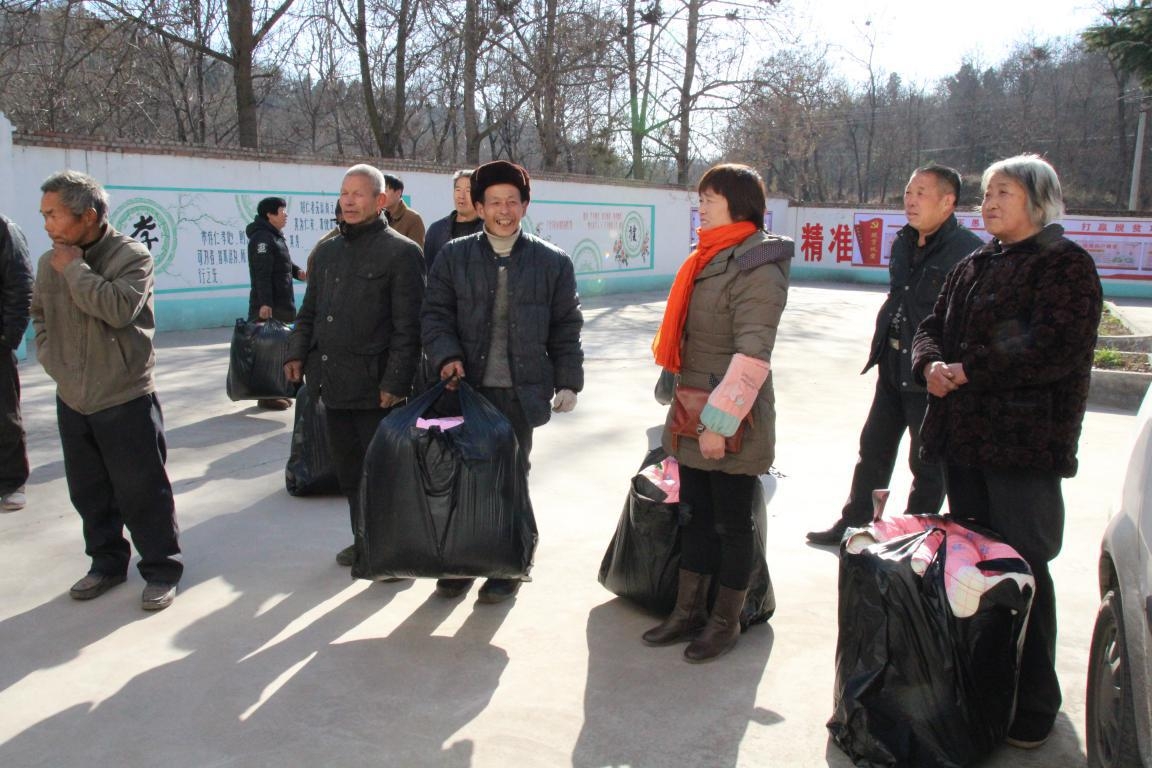 24日,孟津县曙光村贫困户宁素娥从国土资源局帮扶责任人手中接过沉甸甸的被子,激动地说,“还是土地局领导想哩周到,给咱发的还是棉花被子,暖和,真是好!”