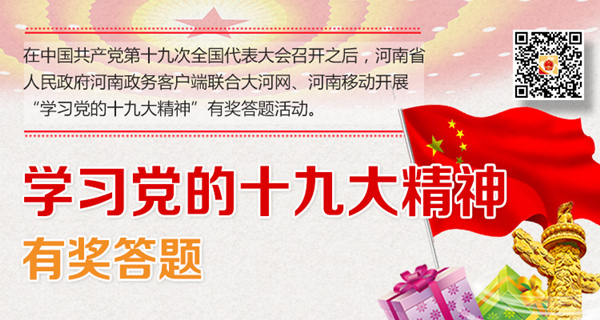 10月18日-24日,中国共产党第十九次全国代表大会在北京召开。为了帮助广大网友强化对党的十九大精神的学习和理解,河南省人民政府河南政务客户端联合大河网、河南移动开展的“学习党的十九大精神”有奖答题活动10月25日正式启动,欢迎广大网友下载河南政务客户端,参与有奖答题。 此次有奖答题活动的题目从党的十九大报告中选取设定,均为单项选择题。活动设定2000个获奖名额,随机抽取2000名幸运网友,每人可获赠河南移动500M省内手机流量红包。本次活动时间为10月25日10时至11月10日24时,活动结束后,主办方将统一为获奖网友赠送手机流量红包。 广大网友可以在苹果、安卓应用平台搜索“河南政务”或扫描文末二维码,下载河南政务客户端,参与有奖答题活动。本次活动仅支持河南移动手机用户,网友答题时需填写有效的手机号码,可多次答题,不重复获奖。 答题四步骤: 第一步:下载安装河南政务客户端。有两种途径:直接扫描下方二维码;在手机应用商店中搜索“河南政务”下载安装。 第二步:打开河南政务客户端,在首页找到“学习党的十九大精神有奖答题”活动专区,在弹出页面中,先阅读“答题小贴士”,再查看学习党的十九大报告,然后点击“开始答题”,进入答题页面。 第三步:每道题下方共有4个选项,在你认为正确的选项前面打“√”,10道题目全部答完后,点击“去提交”。 第四步:请填写有效的河南移动手机号码,最后点击“提交”。 长按或扫描下方二维码,下载河南政务客户端,参与有奖答题。快点行动吧!(记者 李瑞 王靖) ![]() 下载河南政务客户端参与有奖答题 |