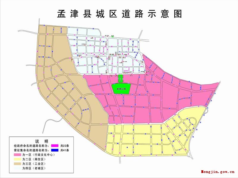 根据县城建设总体规划,县政府于今年十月份下发了《关于征集县城新区部分道路名称的通告》,社会各界反响强烈,我们共收集到道路命名建议500余条。期间,我们召开了四次座谈会对道路拟定名称进行讨论,本着"能反映孟津悠久历史和灿烂文化,具有鲜明向上的时代特色"的指导思想,经过反复讨论推敲,我们决定把在建、新建、规划的道路划分为四大区域,并按照"行政区以古代年号、历史名人文化元素命名,商住区以山川、古地名文化元素命名,工业区以风景、古渡文化元素命名,老城区新规划道路以古地名、名胜文化元素命名"的原则,对县城新区41条道路提出了初步命名意见。