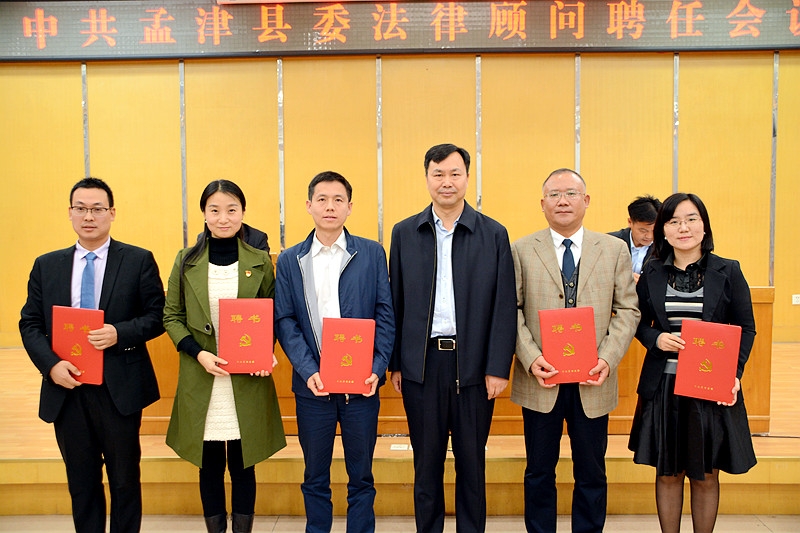 县委书记黄玉国向5名法律顾问、8名法律专家库成员、4家法律咨询机构颁发聘书。就建立法律顾问制度、发挥法律顾问作用等方面,他强调,一要深刻认识建立法律顾问制度的重大意义。建立法律顾问制度是落实上级决策部署的具体行动,是推进孟津法制建设的有力举措,是提高县委依法决策水平的重要保障;二要统筹推进法律顾问制度普遍建立工作。要分层次推进党群系统建立法律顾问制度,要协调推进政府系统实现法律顾问制度全覆盖,要统筹推进国有企业和金融机构建立法律顾问制度;三要充分发挥法律顾问的重要作用。法律顾问要当好党委、政府依法决策的“参谋部”,要当好推动孟津法制建设的“智囊团”,要当好领导干部学法用法的“辅导员”;四要加大对法律顾问制度建设的组织领导。要压紧压实责任、加强管理指导、强化工作保障。